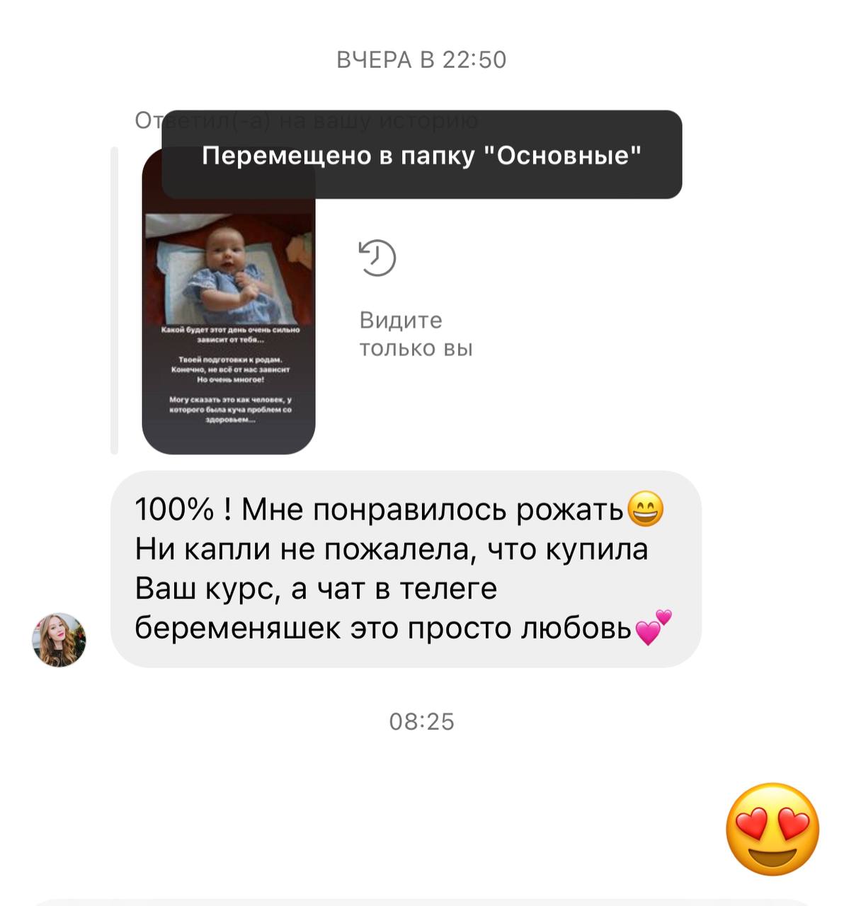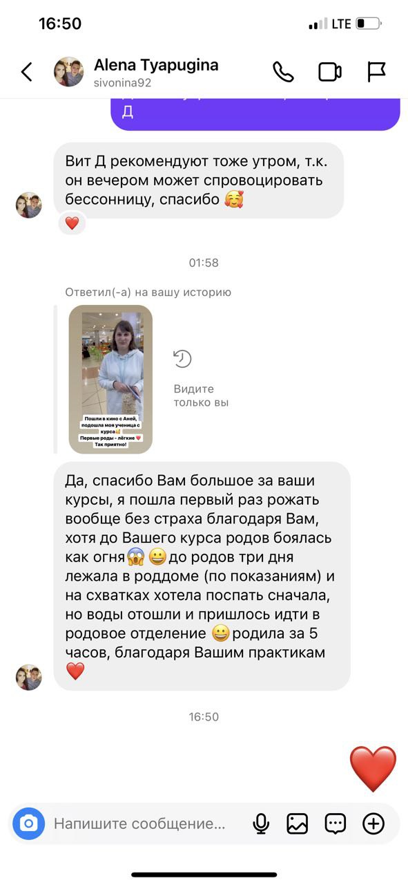 Ты сможешь задать мне все свои вопросы, я ни один не оставлю без внимания. Каждый день я буду присылать тебе новый урок и задания. Уроки очень емкие и включают всю информацию по родам и материнстве.А практика поможет твоему телу все испытать и запомнить на опыте, чтобы применить в момент родов